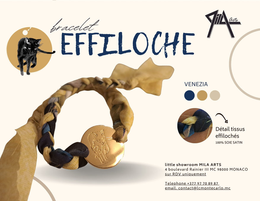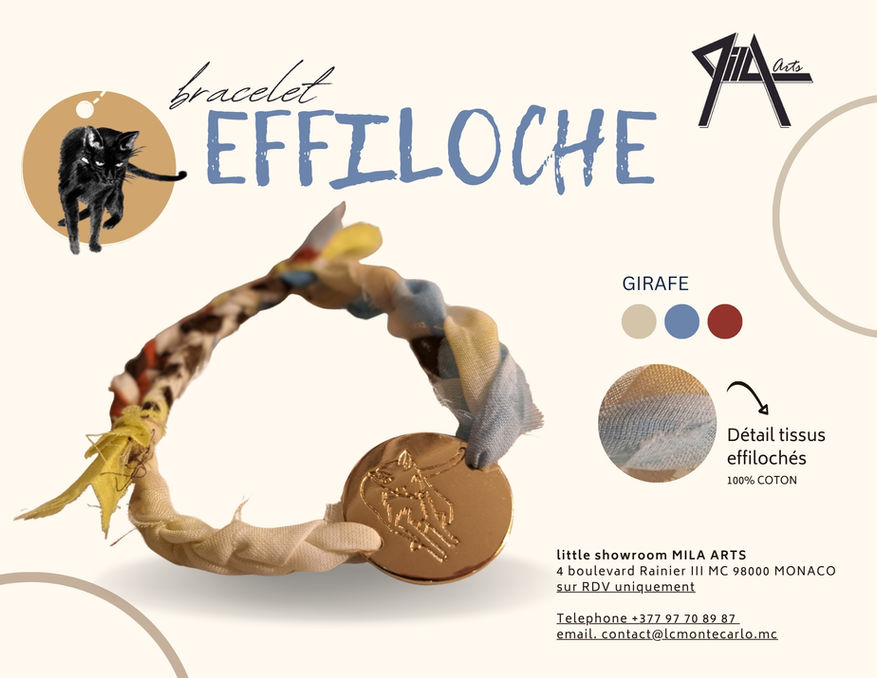 Les bracelets Effilochés, véritables odes à la beauté imparfaite, mettent en lumière les dessins de MILA et ses tissus imprimés, tressés à la main pour donner naissance à des pièces uniques, à la fois artistiques et tendance.